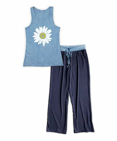 - Includes blue floral racerback tank and navy pajama pants (two pieces total)