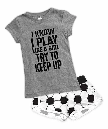 - Includes gray ‘play like a girl’ tee and white and black soccer shorts (two pieces total)