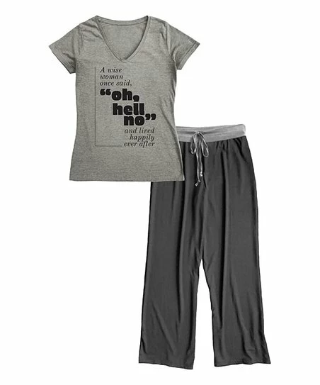 - Includes gray v-neck and charcoal bottoms (two pieces total)