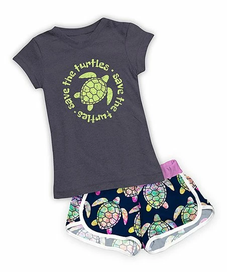 This colorful set showcasing your kid’s love of turtles offers a breathable v-neck tee and lightweight shorts with a complementary pattern.